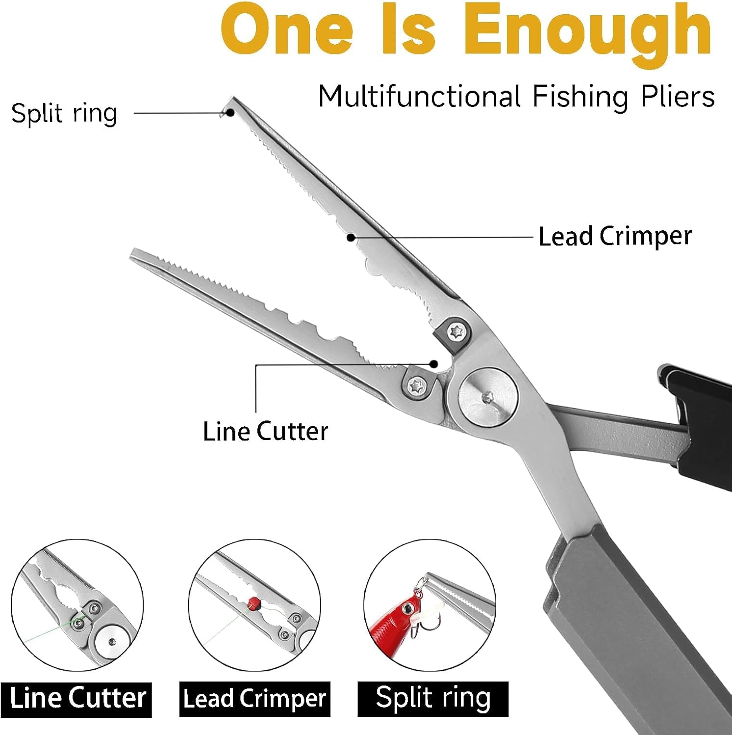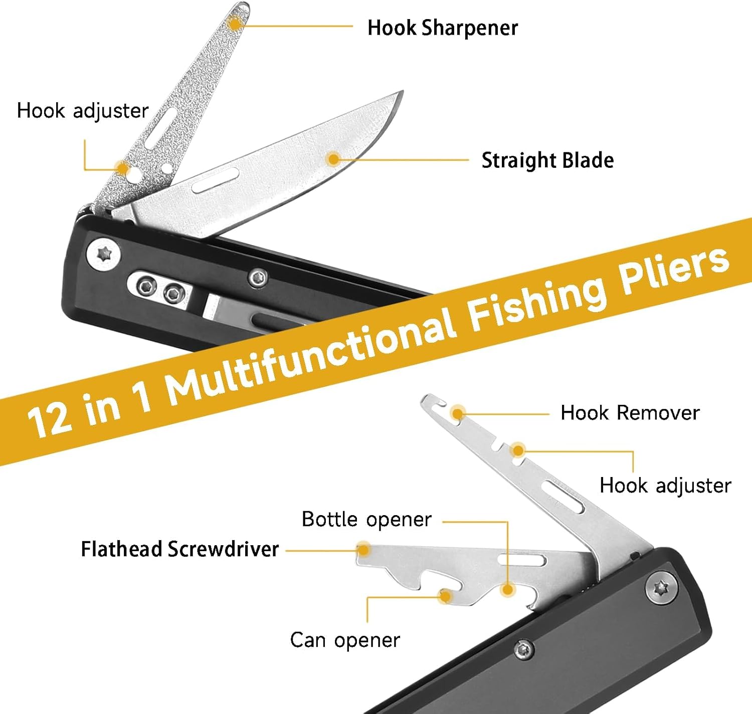 - 12-IN-1 PRO-ANGLER’S ESSENTIAL TOOL: This isn’t just a pliers—it’s a master-tool designed for serious fishing tasks. Equipped with a heavy-duty braid cutter, hook remover, split ring opener, and crimper, it consolidates a full tackle box of tools into one portable device. Features like the hook file and adjuster ensure you’re always ready for the next catch.
