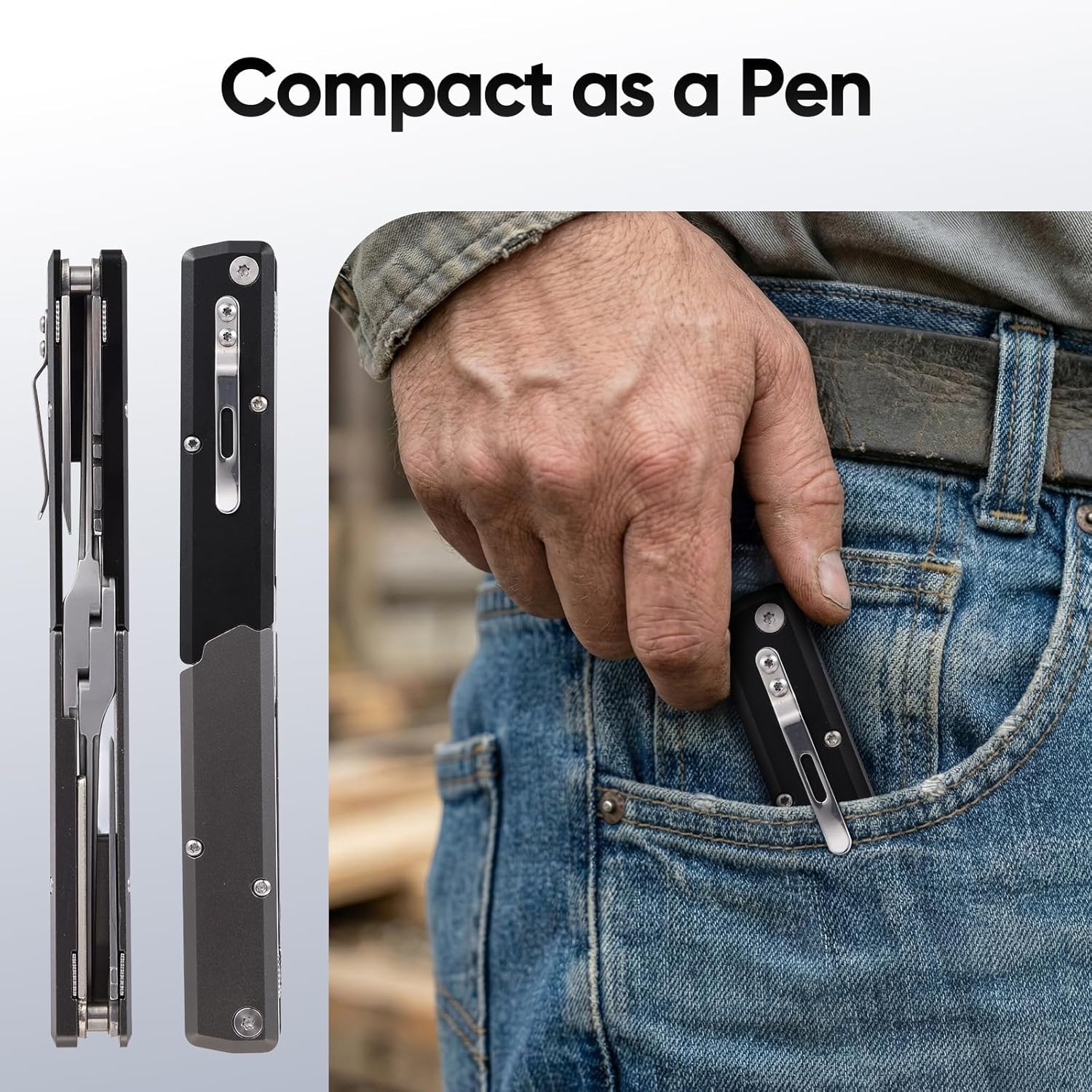 - ULTRA-SMOOTH PEN-SIZED FOLDING DESIGN: Break free from bulky gear. Our unique engineering allows this professional-sized tool to fold into a sleek, pen-sized profile that fits perfectly in your pocket or tackle box. Unlike traditional folding pliers, its snag-free, streamlined body ensures a comfortable, safe grip without scratching your hands or catching on clothing