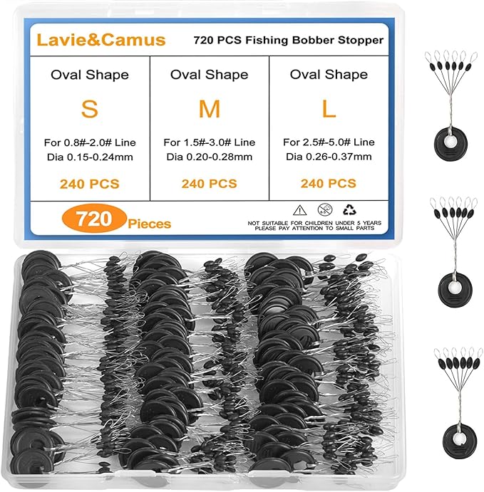- High-Volume Kit: 720PCS Fishing Bobber Stops Kit Contains 120 Rings, Each Equipped With 6 Black Oval Shape Bobber Stoppers, Totaling 720 Stoppers Enough to Meet your Needs. Our High-Volume Kits Can be Reused for a Long Time.