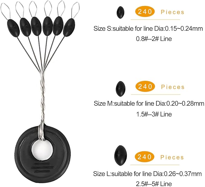 - Size for Line: Our Fishing Rubber Bobber Beads Stopper Set is Available in Three Different Sizes: S, M and L. Size S is Suitable for Line Diameters Ranging From 0.15mm to 0.24mm (0.8#-2#Line); Size M is Suitable for Line Diameters Ranging From 0.20mm to 0.28mm (1.5#-3#Line); Size L is Suitable for Line Diameters Ranging From 0.26mm to 0.37mm(2.5#-5#Line).