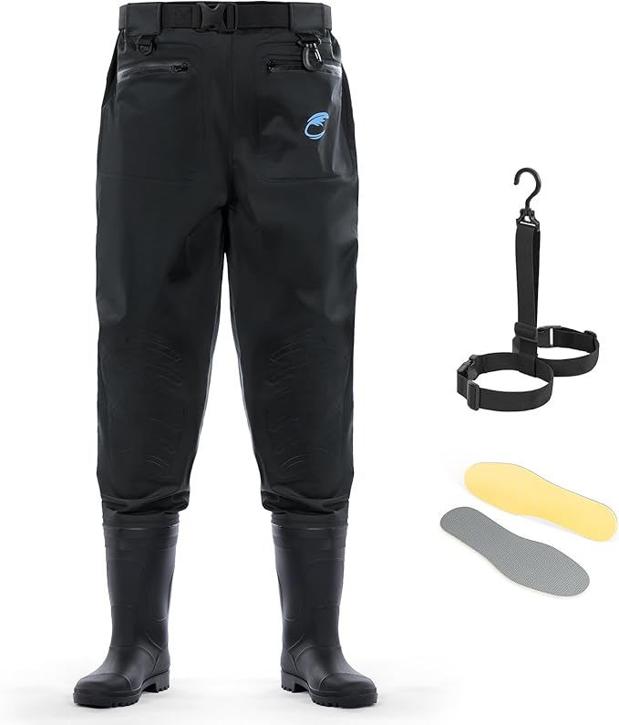 • Adjustable Fit & Practical Storage: Designed for comfort and convenience, these waders feature a wide adjustable waist belt with a quick-release buckle and a built-in elastic waistband for a secure, flexible fit. Two water-resistant pockets protect essentials(Not intended for submersion), while D-ring and carabiner allow easy attachment of fishing tools and gear.
