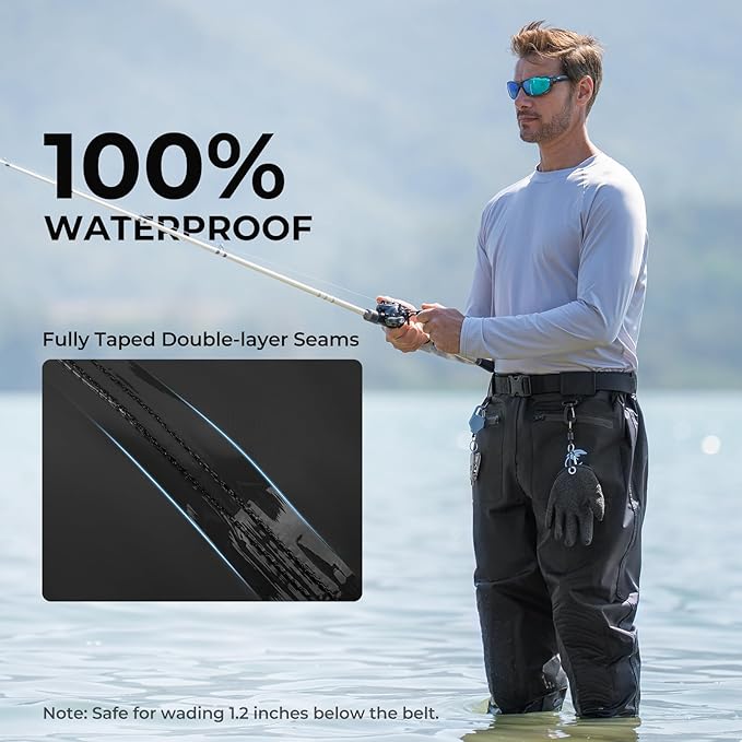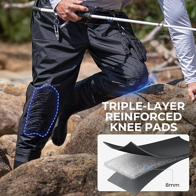 • Durable & Comfortable Design: Designed for long fishing days, these waders feature a soft, skin-friendly interior and fabric with twice the tear and abrasion resistance of polyester or 50D/70D nylon. Triple-layer reinforced knee pads add extra durability, while four breathable eyelets improve airflow for all-day comfort.