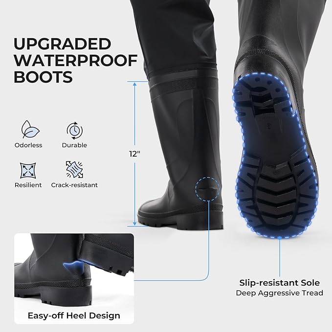• Slip-Resistant Boots Built to Last: Upgraded waterproof boots are odor-free and designed to last up to twice as long as standard wader boots. They remain flexible in cold weather and feature deep aggressive tread for excellent traction on wet rocks, muddy banks, and slippery terrain.