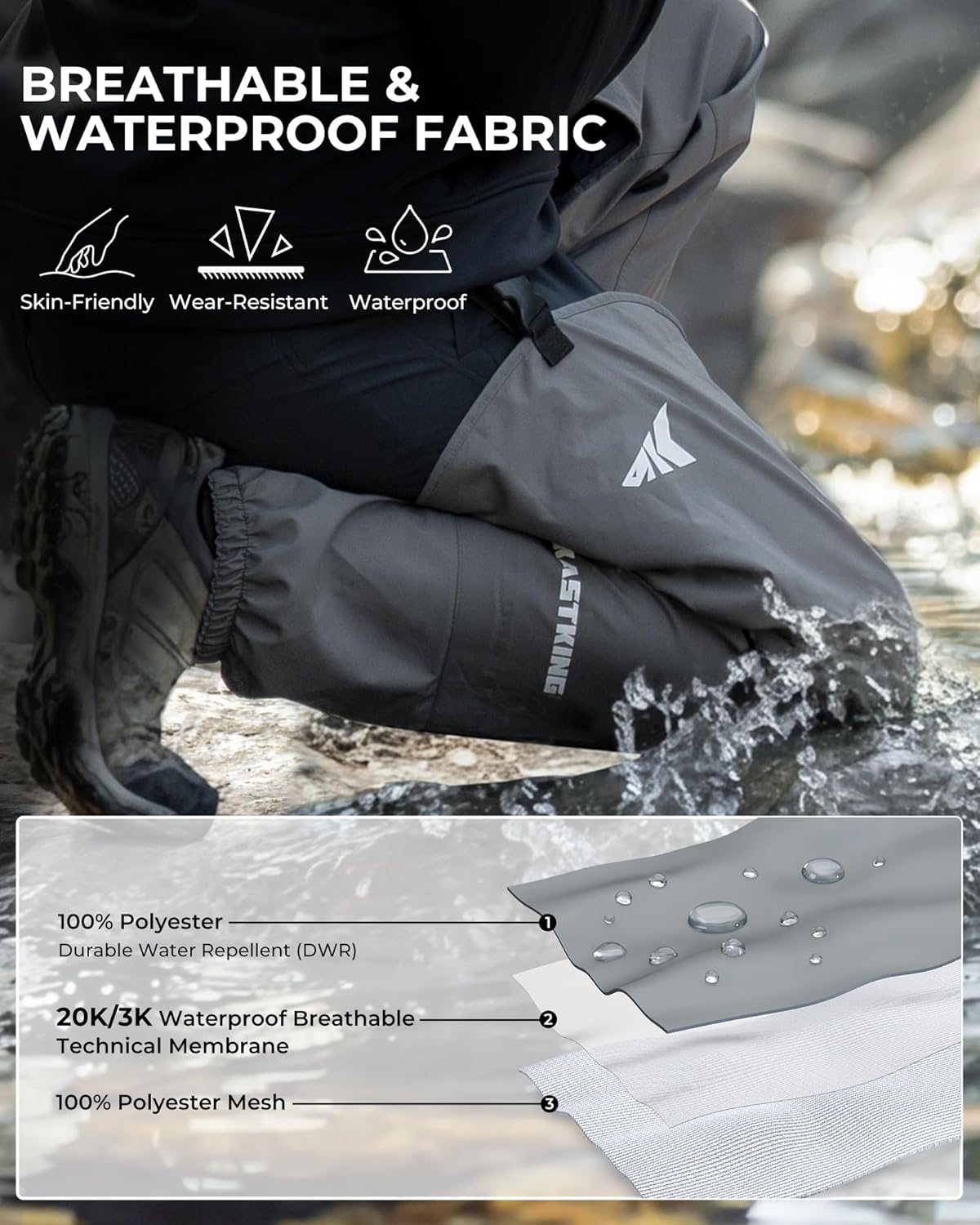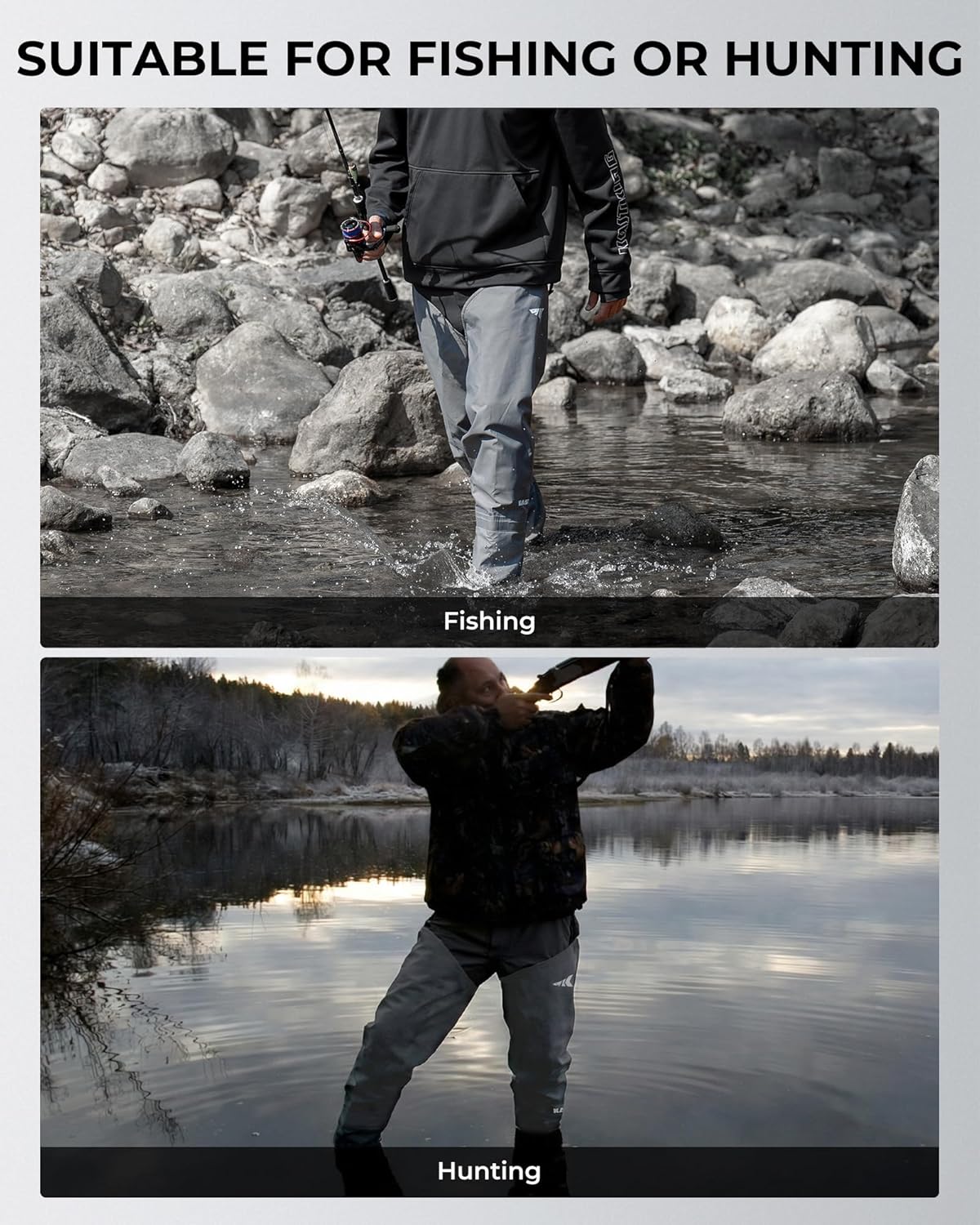 - Breathable Waterproof Hip waders for River Fishing: Built with a waterproof & breathable technical membrane (WPR 20,000 mmH2o/ MVP=3,000g/m²/24hrs(JIS)), and a DWR (Durable Water Repellent) exterior to shed water and reduce clamminess during long days on the bank. Fully taped seams help block leaks at stitch lines so you stay drier in changing conditions
