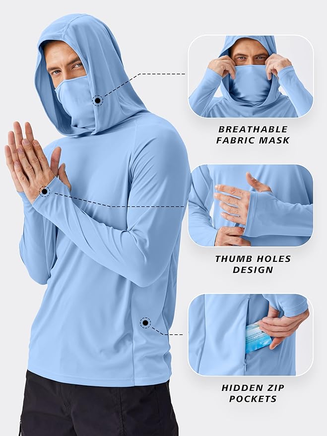 - 【Advanced Practical Designs】Our SPF Fishing Hoodie Shirt is equipped with a convenient sun-blocking hood with mask, keeps you away from dust and bugs.The thumbholes to keep sleeves securely in place and gives extra coverage for sun protection.The hidden side zipper pocket for hiking shirt men which has enough capacity to put your personal belongings, such as your phone, wallet, etc.
